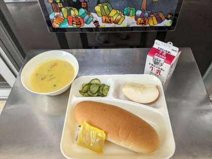 今日のメニューは、豆乳コーンクリームシチュー[米粉]・きゅうりのバジル風サラダ・りんご・コッペパン・アプリコットジャム・牛乳です。豆乳のシチューでしたが、おいしかったです。バジルのお風味を味わいながら、サラダをいただきました。リンゴは新鮮でシャキシャキしておいしかったです。今日もしっかりめしあがれ!