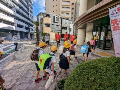 登校の様子です。夢授業で来校してくださったラグビーチームのレッドハリケーンズの皆さんが、正門で子ども達を迎えてくださいました。大きな体の人たちから声をかけてもらいました。元気挨拶をかえす子、驚く子もいました。地域の皆さんも歓迎されていました。