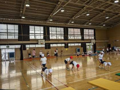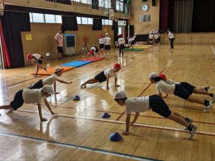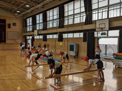体育の授業の様子です。講堂で体づくりの運動をしていました。いろいろな器具を使って運動をしていました。全身を使って筋肉を鍛えるの運動だったので、後で筋肉痛にならないか心配になりました。