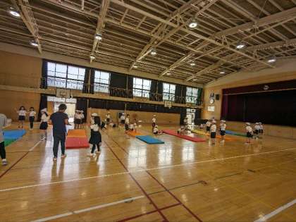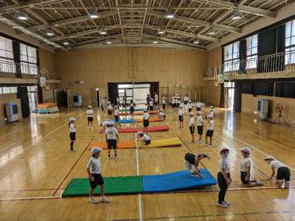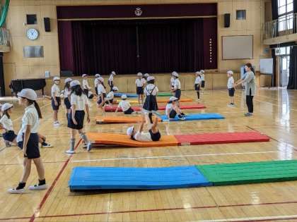 体育の授業の様子です。講堂でマット運動をしていました。開脚前転にチャレンジしていました。勢いをつけてまわらないと、うまく立てないので、思い切りも必要です。みんなできるといいですね。がんばりましょう。