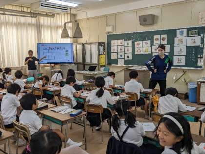 外国語活動の授業の様子です。What〜 do you like〜? の学習をしていました。C−NETと先生の好きなものを予想しながら考えていました。お家に帰ったら家でも使ってみましょうね。