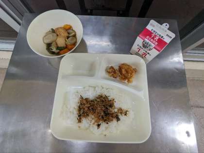 今日の献立は、鶏肉のたつたあげ・おかか菜っ葉・あつあげと野菜の煮もの・ごはん・牛乳です。