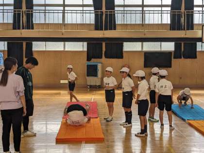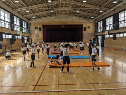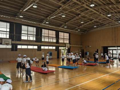 体育の授業の様子です。講堂でマット運動をしていました。2連続の技の練習をしていました。音楽に合わせてタイミングよく回っていました。