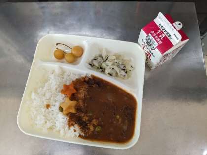 今日の献立は、ハヤシライス[米粉]・キャベツのひじきドレッシング・さくらんぼ(缶)・牛乳です。
