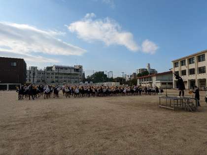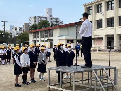 運動場で全校朝会を行いました。健康委員会の姿勢ストレッチに続いて、後期学級代表の認証式と図工展の表彰を行いました。今日から後期時間割が始まります。しっかりがんばりましょう。