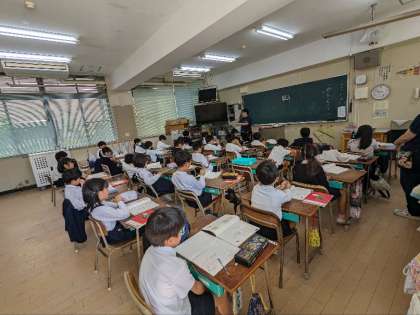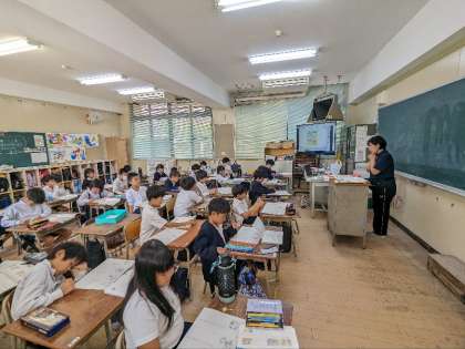 国語の授業の様子です。お話作りをしていました。オリジナルの物語を考えながら、ワークシートに記入していました。出版できるような素晴らしい作品を描き上げましょう。
