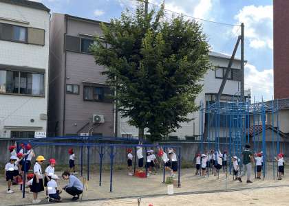 1年生:体育 長縄跳び、のぼり棒とうんてい、鉄棒と3か所に移動して身体を動かしました。