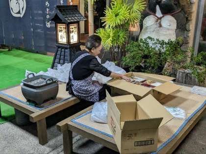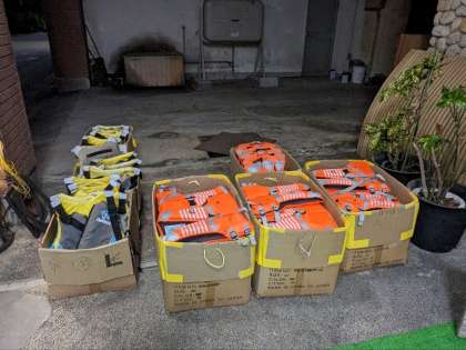 おはようございます。修学旅行2日目の朝を迎えました。いいお天気です。夜明け前の鳥羽の様子です。右上に明けの明星が輝いています。大女将が、お弁当の準備中です。子ども達のライフジャケットも用意されています。