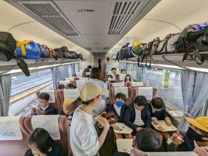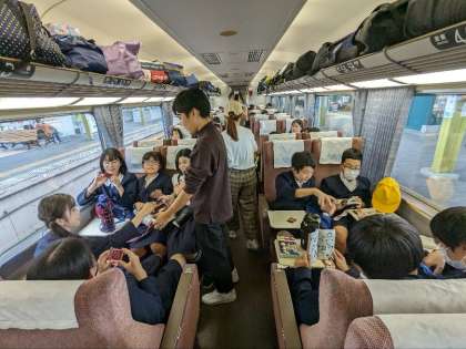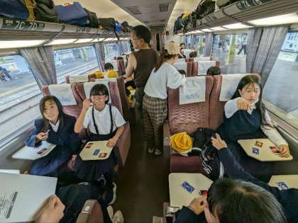 車内の様子です。6人に1人が当たる辛子入りロシアンクッキー大会をしました。8人分の当たりがあるはずなのに、7人しか申告しませんでした。あと一人は、誰なんだろう?ちなみに、教職員で1人だけ当たったのが、校長先生でした。校長先生は、珍しいクッキーを食べられて喜んでいました。まだ口の中辛いけど。