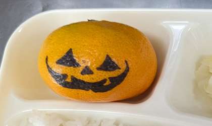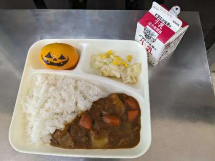 今日の献立は、ポークカレーライス[米粉]・サワーソテー・みかん・牛乳です。みかんに、何やら怪しい顔が・・・・・・・・。