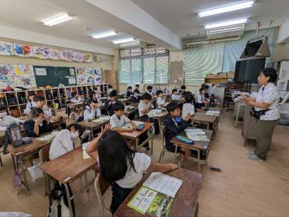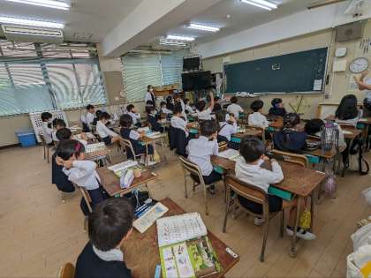 森のたんけんたいを歌っていました。コンコンという音を机をたたいて表現していました。たたいてリズムを取りながら歌うのは楽しいですよね。