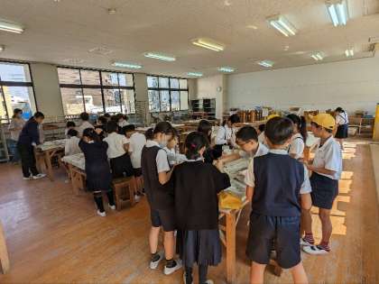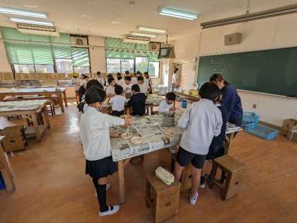 図画工作科の授業の様子です。素焼きした作品に釉薬を塗っていました。次が本焼きになりますね。思い通りの作品に仕上がるといいですね。