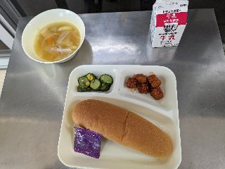 今日のメニューは、マグロのオーロラ煮・スープ・きゅうりとコーンのサラダ・コッペパン・ブルーベリージャム・牛乳です。