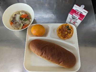 今日の献立は、豚肉と野菜のスープ煮・変わりピザ・みかん・黒糖パン・牛乳です。スープ煮は、スープに肉と野菜がしっかり煮込まれ、おいしかったです。ピザは、変わっていました。みかんは、旬の味!ジューシーでした。
