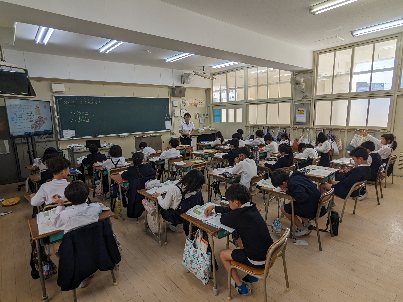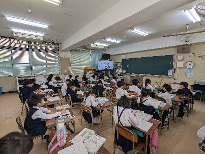 算数の授業の様子です。四の段の九九の学習をしていました。かけ算の仕組みについて考えていました。思いついたことを積極的に手をあげて発表していました。