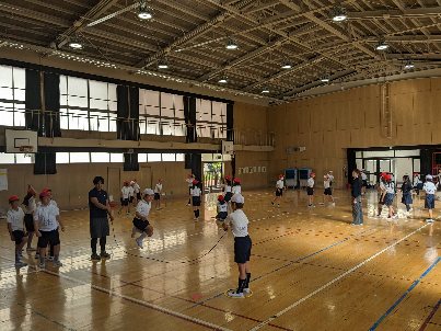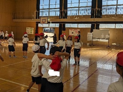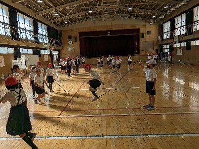 体育の授業の様子です。講堂で長縄跳びをしていました。声をかけて跳んだり、曲のリズムに合わせて、輪の中に入ったりと、工夫して挑戦していました。長く跳び続けられるといいですね。