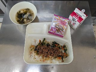 今日の献立は、ビビンバ・わかめスープ・芋けんぴフィッシュ・牛乳です。ビビンバは、具も多く、ひき肉も甘く味がついており、おいしかったです。わかめスープのわかめが歯ごたえもあり味もよく、おいしかったです。芋けんぴのカリカリ感がたまりませんでした。