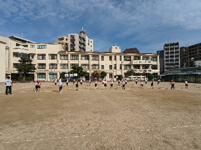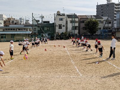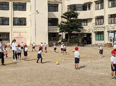 体育の授業の様子です。運動場でボールを使った運動をしていました。投げるのもとるのも練習をしないとうまくなりません。がんばって上手にできるようにしましょう。休み時間にも、友達と練習してみましょう。