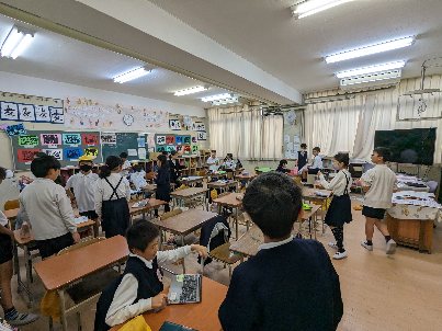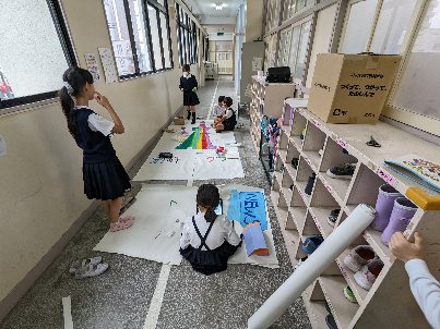 図画工作科の授業の様子です。発表会に使う背景画等を描いたり、小道具を作っていました。発表まで2週間ですね。来週には、舞台練習も始まります。がんばりましょう。