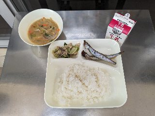 今日の献立は、焼きししゃも・みそ汁・こまつなのいためもの・ご飯・牛乳です。