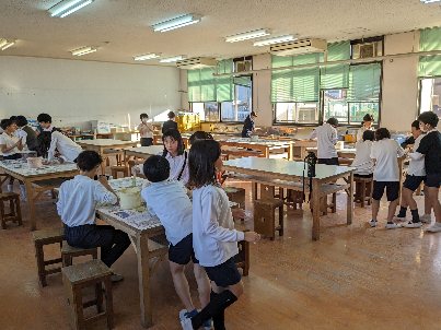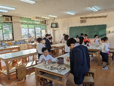 図画工作科の授業の様子です。陶芸作品に釉薬を塗っていました。むらなく丁寧に塗りましょう。きれいに焼き上がりますよ。もう何度も作っているから、言わなくてもわかっていますよね。いい作品になるといいですね。