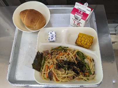 今日のメニューは、ウインナーときのこの和風スパゲッティ・焼きとうもろこし・固形チーズ・黒糖パン・牛乳です。
