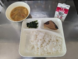 今日の献立は、なまりぶしのしょうが煮・なめこのみそ汁・ほうれんそうのごまあえ・ごはん・牛乳です。