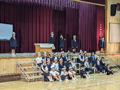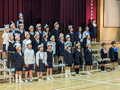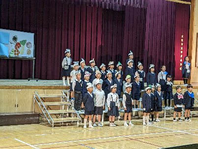 1年生は、初めての発表会でした。「サラダでげんき」の劇を発表しました。みんなで場面をつないで、元気いっぱい役を演じ切りました。動きもとても素敵でした。