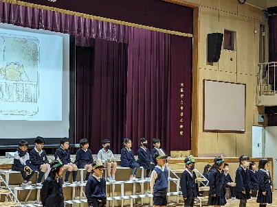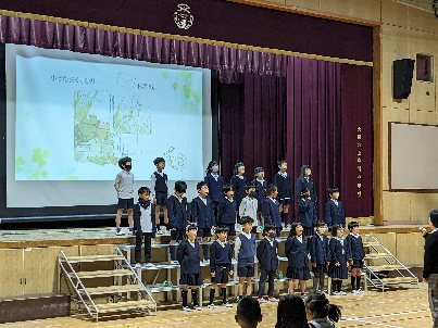 2年生も初めての発表会でした。教科書に出てくる「お手紙」の朗読劇でした。欠席者が多かったのですが、休んでいる子の分をみんなでつないで途切れることなくやり切りました。素晴らしかったです。歌もとっても上手でした。