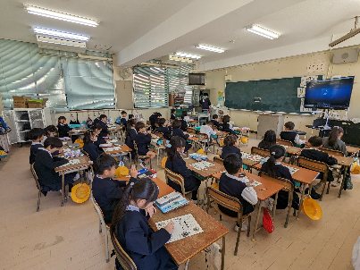 音楽の授業の様子です。鑑賞の学習をしていました。楽曲を聞いて感想を書いていました。子ども達は、曲に合わせて体を動かしてリをズムとっていました。可愛らしかったです。