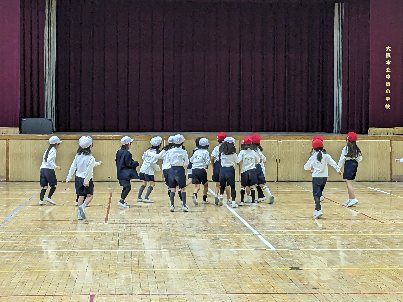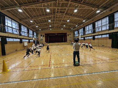 体育の授業の様子です。講堂でサッカー形式のボール遊びをしていました。みんなで一生懸命にボールを追いかけていました。寒い日ですが汗をかいてがんばっていました。
