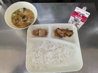 今日の献立は、鶏肉の甘辛焼き・みそ汁・大根の煮物・ごはん・牛乳です。