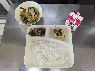今日の献立は、具だくさん卵の千草焼き・五目汁・豚肉とさんどまめのいためもの・ごはん・牛乳です。