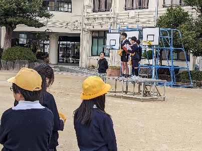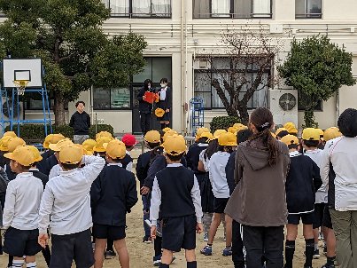 空気が暖かく、よく晴れた朝、運動場で全校朝会を行いました。いつものように健康委員会の姿勢ストレッチを行いました。校長先生のお話に続いて、看護当番から先週の反省と今週の目標についての話がありました。