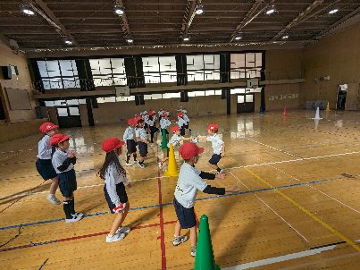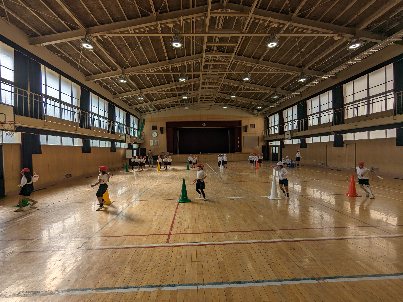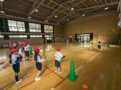 体育の授業の様子です。講堂で折り返しリレーをしていました。速く走れるようにチームで、協力していました。みんなの応援する声が、講堂に響いていました。
