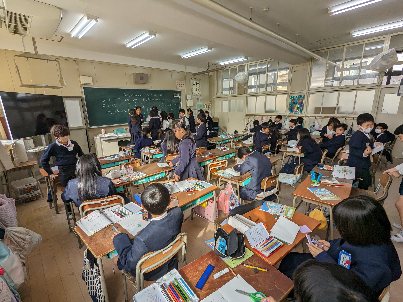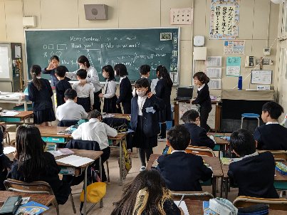 外国語活動の授業の様子です。クリスマスカードを作っていました。英文を書いて、イラストを描いたり、色紙を貼り付けていました。誰にあげるのかな?気になりますね。