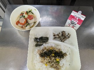 今日は、正月の行事献立です。ちらし寿司は酢の加減がよく、れんこんはぱりぱりとしておいしかったです。ぞう煮は、もちがもとろとろで、まったりとしておいしかったです。ごまめもぱりぱりとした食感に、上品な甘さが絡み最高でした。