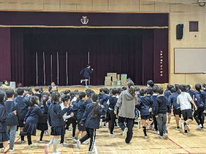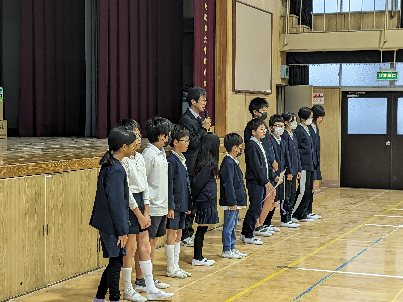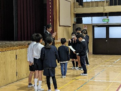 降雨のため講堂で全校朝会を行いました。最初に、健康委員会の姿勢ストレッチを行いました。続いて、子ども会のソフトボールチームの表彰を行いました。大会で準優勝しました。すばらしいですね。