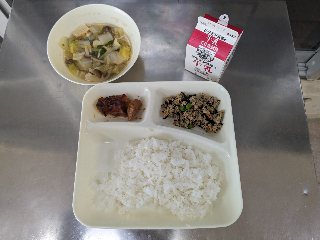 今日の献立は、鶏肉の甘みそ焼き・五目汁・高野どうふのいり煮・ごはん・牛乳です。