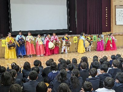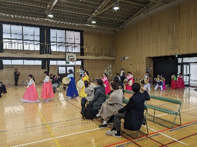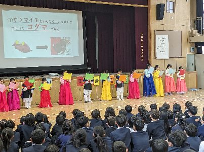 インフルエンザの感染拡大で、延期になっていた民族クラブの発表会を行いました。入場ケンガリ・チャンゴをたたきながらの行進の後、一人ずつ自己紹介をしました。