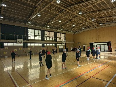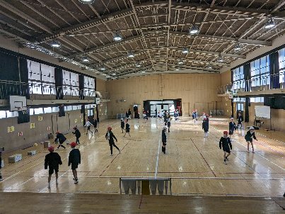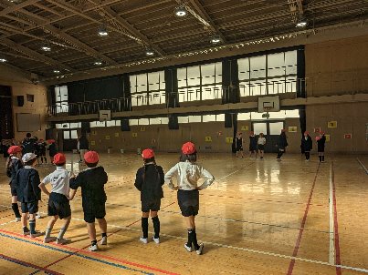 体育の授業の様子です。講堂でボールを使った運動をしていました。パスを回したり、的をねらって投げたりと、いろいろな運動をしていました。基本を身につけるには、いい学習ですね。