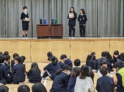 今日の集会は、色水の変化当てクイズです色水の一部水の一部の並び順や色が変わります。それを当てるクイズです。みんなで集中して観察していたので、ほとんどの班が正解でした。みんなでみんなをたたえ合いました。