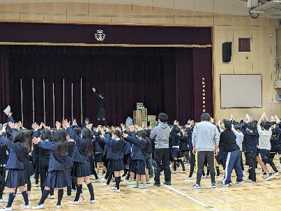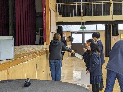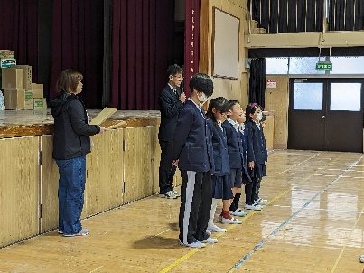 昨日の雨のため運動場が使えず、講堂で全校朝会を行いました。健康委員会の姿勢ストレッチを行いました。続いて、読書感想文コンクールの表彰を行いました。