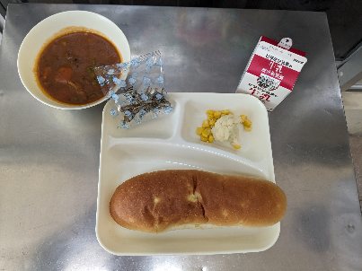 今日のメニューは、ビーフシチュー・ミニフィシュ・カリフラワーとコーンのサラダ・おさつパン・牛乳です。