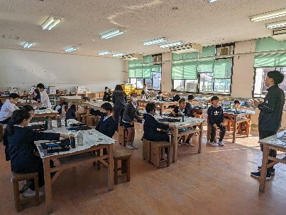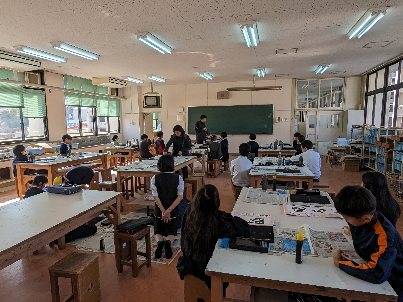 国語の授業の様子です。図工室で、書き初めをしていました。毛筆で「明るい心」と書きます。一筆一筆ていねいに描きましょう。それが上達派の近道です。がんばりましょう。