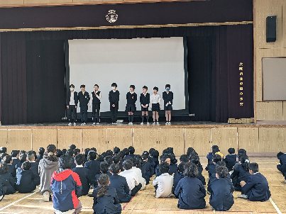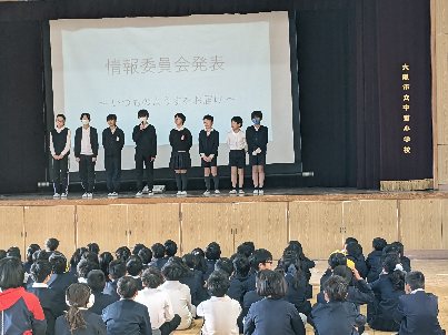 今日の集会は、情報委員会発表でした。日ごろの活動の様子を映像と劇で紹介していました。楽しそうに活動する姿を見て、来年度に情報委員会に入りたいと思った子も、多くいることでしょう。