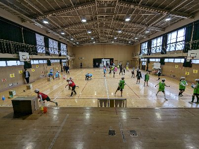 体育の授業の様子です。たくさんの先生が見ている中、講堂でボールゲームをしていました。大きな声を出していつも以上にはりきっている姿が印象的でした。みんながんばっていました。