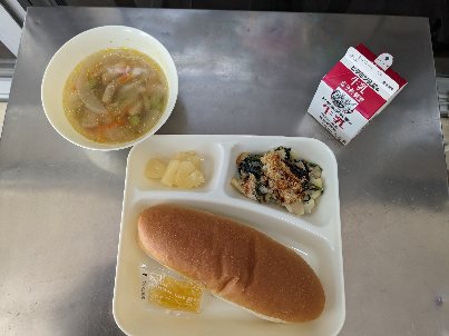 今日の献立は、ほたて貝のグラタン・スープ・パインアップル(カット缶)・コッペパン・マーマレード・牛乳です。