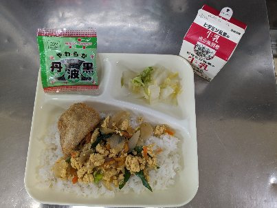 今日の献立は、カツ丼・はくさいの甘酢あえ・ソフト黒豆・ごはん・牛乳です。