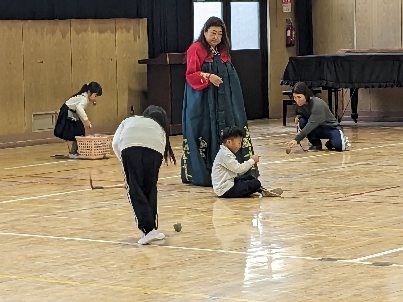講堂で民族クラブの活動を行いました。今日はいろいろな遊びをしました。寒い日だったのですが、体を動かして、暖かかったです。チェギやペンイ・独楽やリングを使って楽しみました。